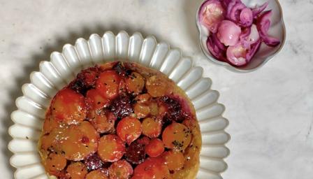 Carefully remove the pan from the oven using oven gloves, as the handle will be hot, then use a spatula to loosen the pastry from the sides. Leave to cool for 5 minutes then turn out onto a plate. Enjoy with a green salad and the pink pickled onions alongside.