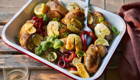 Mediterranean-style chicken traybake with halloumi