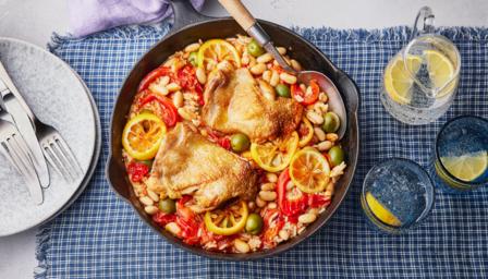 Scatter over the lemon slices (if you’re not a big fan of lemon, add fewer slices to the pan) and put the lid on. Cook with the lid on for 10–15 minutes, giving everything a stir every now and then, until the chicken thighs are cooked through.