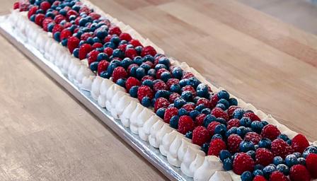 This pavlova style dessert baked in two rectangles looks spectacular arranged down the length of the table and it is easy to serve. The meringue can be made days ahead too. Top with your favourite fruits.