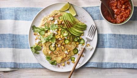 Place the pudla onto serving plates and top with the reserved spring onions, corn, feta, coriander, jalapeño and an optional sprinkling of chilli powder. Serve the pudla with tomato salsa, lime wedges and sliced avocado.