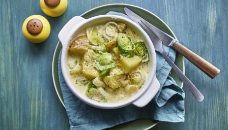 A simple, quick and satisfying gratin-style supper that’s given a touch of indulgence with the addition of a little cream. Serve just as it is or with some bread for mopping up all the delicious sauce.