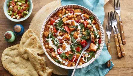 A fabulous and filling vegetable curry, topped with a drizzle of cream and served with warm naan breads. Even if you usually pick a chicken or meat curry, give this one a go – it’s packed with flavour, easy to make and there’s very little washing up at the end.