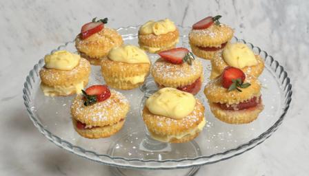Once the muffins have cooled, cut in half and fill them with the lemon filling and cooled strawberry mix. Top the lemon ones with more lemon cream and garnish with lemon zest. Top the strawberry ones with the sliced strawberries. Dust with icing sugar.