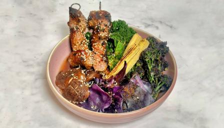 Miso-marinated beef skewers with grilled vegetables and soy beef broth