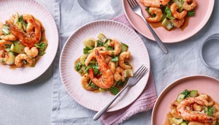 2. Heat the sunflower oil in a large frying pan or wok over a high heat. Add all the prawns and their marinade and fry for 3–4 minutes, until cooked through, pink and slightly sticky.