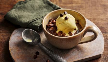 Microwave on high for 45–60 seconds (for an 800W microwave, adjust timings for other wattages) until the brownie is bubbling and cooked but still a bit gooey in the middle. Remove from the microwave and sprinkle with the chocolate chips, if using. Leave to cool for 1 minute then serve with a scoop of vanilla ice cream on top, if preferred.