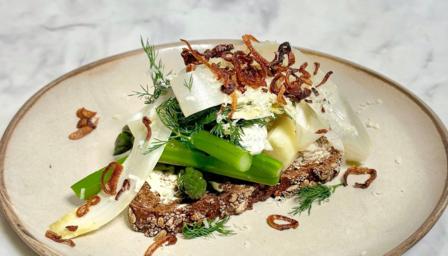 To serve, place the grilled bread slices on serving plates. Arrange both the blanched and raw asparagus on the bread. Drizzle with horseradish cream, then sprinkle grated cheese over the top. Garnish with the crispy shallots and some fresh dill to finish.