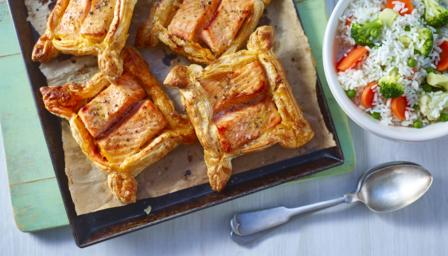 Remove the baking tray from the oven and place it onto a heatproof surface. Arrange the salmon-and-pesto parcels onto the tray, then bake them in the oven for 20-25 minutes, or until the pastry has risen and is golden-brown, and the salmon is cooked through.