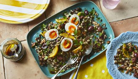 In a large salad bowl add the cooked pearl barley, kalamata olives, puy lentils, parsley, pecans and orange segments. Roughly mix and leave to one side.