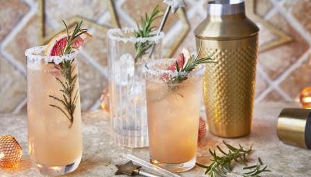 Fill your prepared glasses with ice cubes then pour over the cocktail and divide the sparkling water between them. Stir gently to combine and garnish with the grapefruit wedges and a sprig of rosemary, if you like.