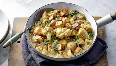 Stir in the mango chutney, cream, roasted cauliflower and sweet potato and the spinach. Stir until heated through and the spinach has wilted. Stir in the lemon juice and season with salt and pepper.