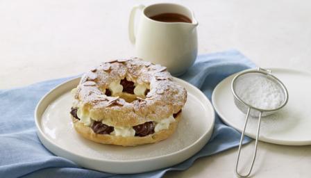 Pipe generous amounts of the chocolate filling and Chantilly cream onto the pastry base. Top with the pastry lid and dust with icing sugar. Serve the chocolate sauce in a jug alongside.