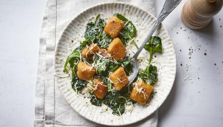 Add the spinach and allow to soften and wilt in the pan for a few seconds, stirring and lightly tossing with the gnocchi. Remove from the heat. Divide the gnocchi and spinach between two bowls and sprinkle with the grated cheese to serve.