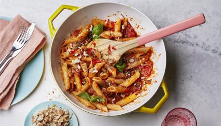 Cook the pasta according to the packet instructions. Drain, reserving the cooking water, and toss with the sardine and tomato sauce, adding a splash of the pasta cooking water if needed to loosen. Mix half of the toasted pitta breadcrumbs in a bowl with some basil leaves and red chilli, if using. Place the remaining pitta breadcrumbs in an airtight container and store at room temperature. Sprinkle the pasta with the basil and breadcrumb mixture and serve.