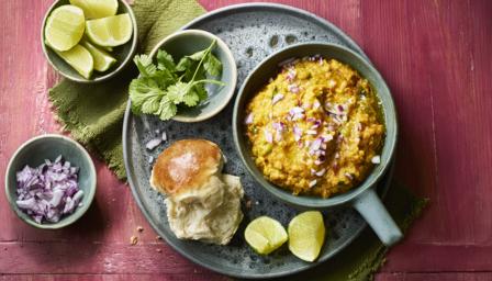 To serve, ensure the bhaji is warm and add the remaining butter and onions. Serve in soft rolls finished with a squeeze of lime juice and a sprinkle of coriander to each individual serving.
