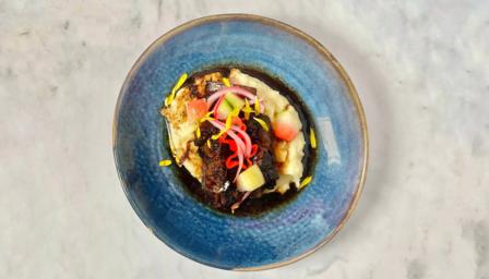 Place the whipped yam onto a serving bowl or plate and top with the rib and reduced sauce. Garnish with the pickled Scotch bonnet, red onions, and watermelon rind.