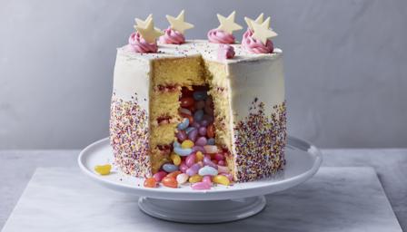 This pretty piñata cake is fantastic for a birthday or a special occasion. It's filled with jelly beans for a burst of colour when the cake is cut into, but you can use whatever sweets you like.