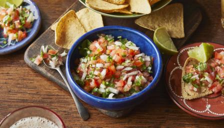 This fresh tomato salsa – known as pico de gallo in Mexico – is delicious as a side dish, a topping for tacos, or a dip to serve with tortilla chips. There are different versions, but when made with red tomatoes, white onion, coriander and green chilli, it is sometimes called ‘salsa mexicana’ or ‘salsa bandera’, because it has the colours of the Mexican flag.