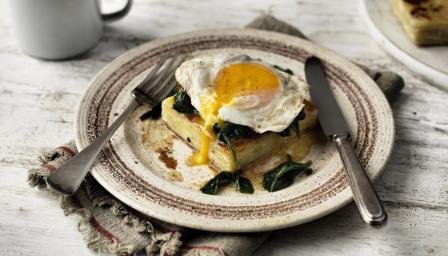 Potato gratin, fried egg and spinach
