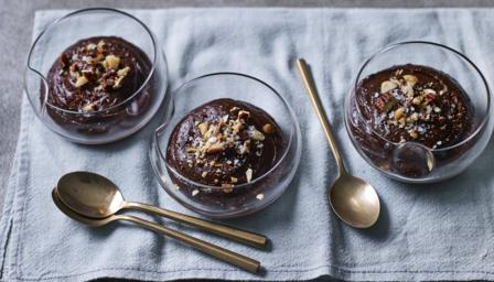 Spoon the mousse evenly into glass bowls and grate chocolate over each portion. Sprinkle with the chopped nuts and sea salt flakes to serve.