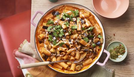 When I can’t decide between Italian and Indian for dinner, I make this spicy, creamy rigatoni with fried aubergine in makhani sauce.