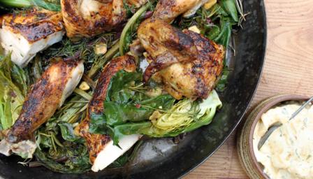 Once the greens are cooked, place on a large serving dish with the portions of chicken on top. Serve with the smoked garlic mayonnaise.