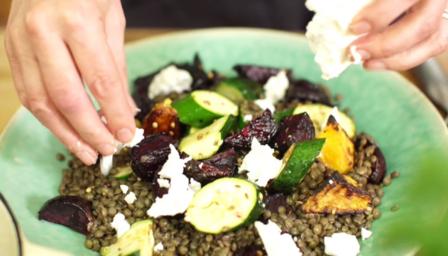 Put the beetroot and butternut squash on a tray, coat with olive oil and cook for 45 minutes or until cooked through. Then add the courgette to the tray, sprinkle with the spices and return to the oven for 5-10 minutes until the courgette is slightly cooked but still has a crunch.