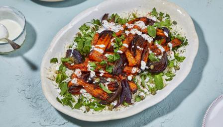 To serve, toss the mint and parsley leaves through the yoghurt. Top the roasted carrots and onions with the yoghurt dressing, and scatter with capers to finish.
