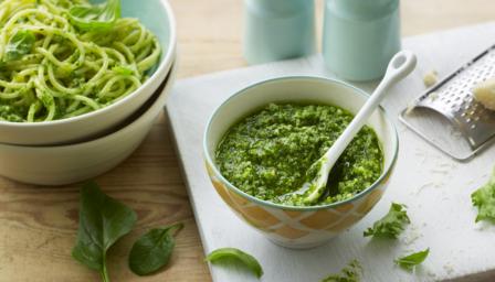Any combination of salad leaves will work for this pesto, but rocket-based salads are particularly good. You can make it with leftover mint or parsley instead of basil too.