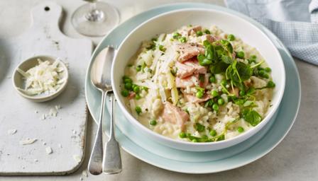 Salmon risotto is such a quick and easy dish: the creamy rice is complemented here by the salmon and peas. Be careful not to overcook the risotto, though, or it will be stodgy.