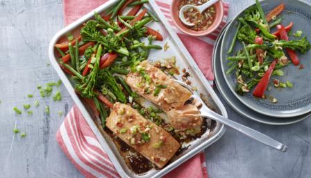 Put the salmon fillets, skin side down at one end of the roasting tin. Tip the broccoli, beans and peppers into the other end of the roasting tin. Top with the red peppers and pour over the soy sauce mixture. Toss the vegetables to coat in the sauce. Loosely cover the vegetables with kitchen foil, leaving the salmon exposed. Roast for 12 minutes.