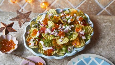 Repeat with the last of the crisps and all of the remaining toppings, so that everything is nicely layered up. Spoon little piles of the caviar over the top, if using.