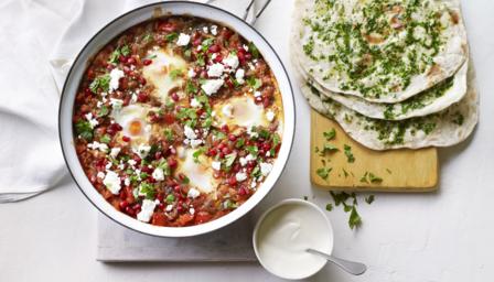 10. As soon as eggs are cooked, remove the pan from the heat. Sprinkle the feta, remaining parsley and pomegranate seeds over the shakshuka and scatter with chorizo, if using. Serve with the yoghurt and flatbreads.