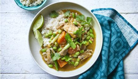 Bulking out a curry with vegetables is a great way to stretch a small amount of meat to keep the cost down. But, if preferred, simply swap the sweet potatoes and edamame beans for two extra chicken thighs.