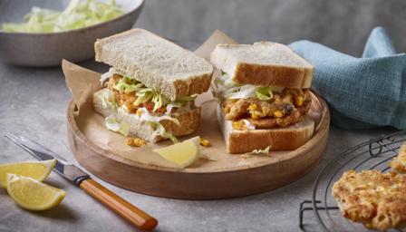 To serve, mix the mayonnaise with the lemon juice in a small bowl and spread half on one slice of bread. Top with half of the fritters followed by half of the shredded lettuce and finish with another slice of bread. Repeat to create the other sandwich. Cut the sandwiches in half and serve.
