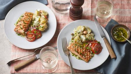 Use woodchips and a barbecue to cook your trout Stein-style, then serve with a quick chive dressing, luxury potato salad and plenty of fresh tomatoes.