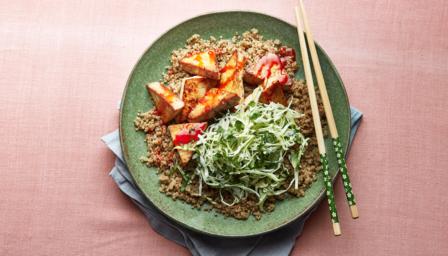 Serve the tofu pieces alongside the cabbage slaw and the quinoa, fluffed up with a fork, and drizzled with the Korean-style chilli sauce.