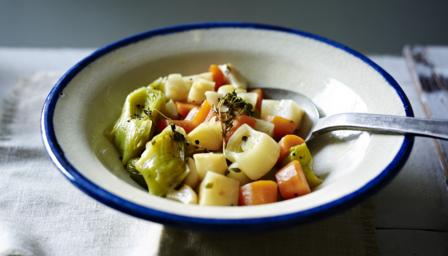 Bring up to the boil, then reduce the heat to the absolute minimum. Cover the pan with a lid or foil and leave to cook very gently for about an hour, stirring occasionally to make sure that it doesn't catch. If necessary add an extra splash of water, or if it ends up too watery, uncover and boil the water off. Either way, you are aiming to end up with meltingly tender vegetables, perhaps slightly patched with brown towards the end of cooking, with little more than a few tablespoonfuls of syrupy liquid left in the pan. Serve warm.