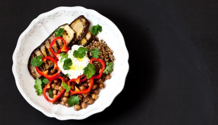 Spiced chickpea, red pepper, aubergine and quinoa grain bowl