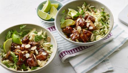 Spoon the orzo into a warmed serving bowl for sharing and top with the sticky chicken. Scatter the flaked almonds and fresh coriander on top and serve lime wedges for squeezing on the side.