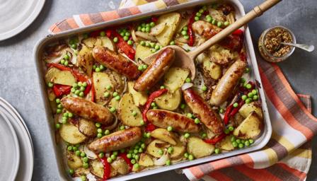 Sweet and sticky sausages with colourful roasted veg make for a brilliant all-in-one traybake that the family will love.