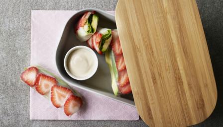 These easy summer rolls are packed with veggies and perfect for kids' lunchboxes, with a creamy yogurt sauce in a separate pot for dipping.