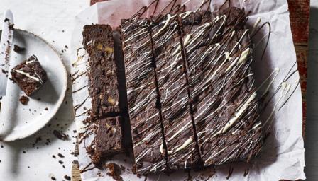 Scrape into the prepared tin and bake for around 30 minutes, until the top has set and is looking dry. A skewer should come out sticky, not clean or covered in wet batter. Leave to cool then drizzle with the melted dark and white chocolate. Cut into squares and serve (or keep until the next day when they will taste at their best).