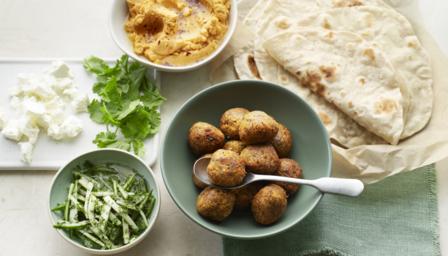 Put the cooled sweet potato and all the remaining falafel ingredients in a food processor and blend to a coarse paste. Add a drizzle of olive oil to bind the mixture if necessary and season generously with salt and pepper. Using wet hands, divide the mixture into 12 equal-sized small balls. Place on a tray lined with baking paper and chill in the fridge for 30 minutes.