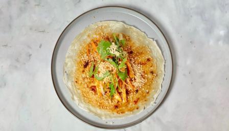 Thin crêpe-like pancakes are piled with hoisin sauce, crunchy veg and sliced omelette, and rolled up with sweet and salty peanut sugar. Serve with Chinese chicken curry.