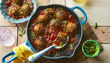 To make the meatballs, heat 1 tablespoon of the oil in a large frying pan on a medium heat. Add the onion, season with salt and pepper and fry for about 10 minutes, or until golden and caramelised.