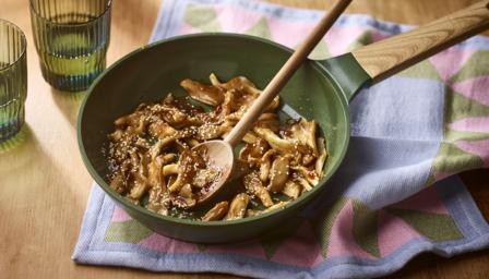 Put a large frying pan over a medium heat. Add the sesame oil and mushrooms, then fry until golden on all sides (don’t overcrowd the pan – you might need to fry in batches). You want the mushrooms to caramelise, not sweat.