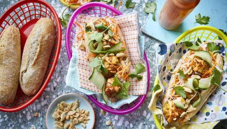 To assemble, split each baguette and pull out the doughy middle. Spread a generous amount of sriracha mayo over each baguette, then add some pickled veg and meatballs. Add more sriracha mayo, some coriander, cucumber ribbons and a sprinkling of peanuts. Serve immediately.
