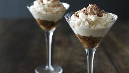 Break each Savoiardi sponge finger into about four and drop the pieces into four small martini glasses, then pour the cooled espresso mixture over them. Press down gently, making sure the biscuits are soaked all over.